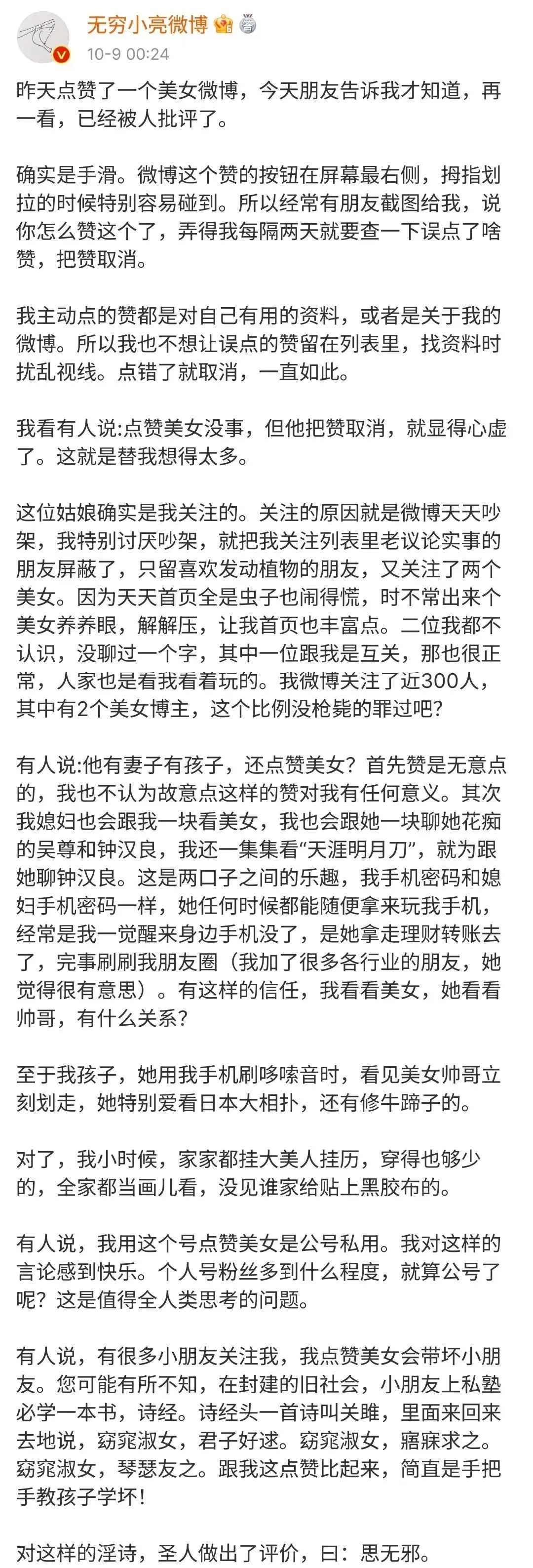 无奈之下,无穷小亮出来发了篇长文回应:自己点赞美女,只是因为手滑。