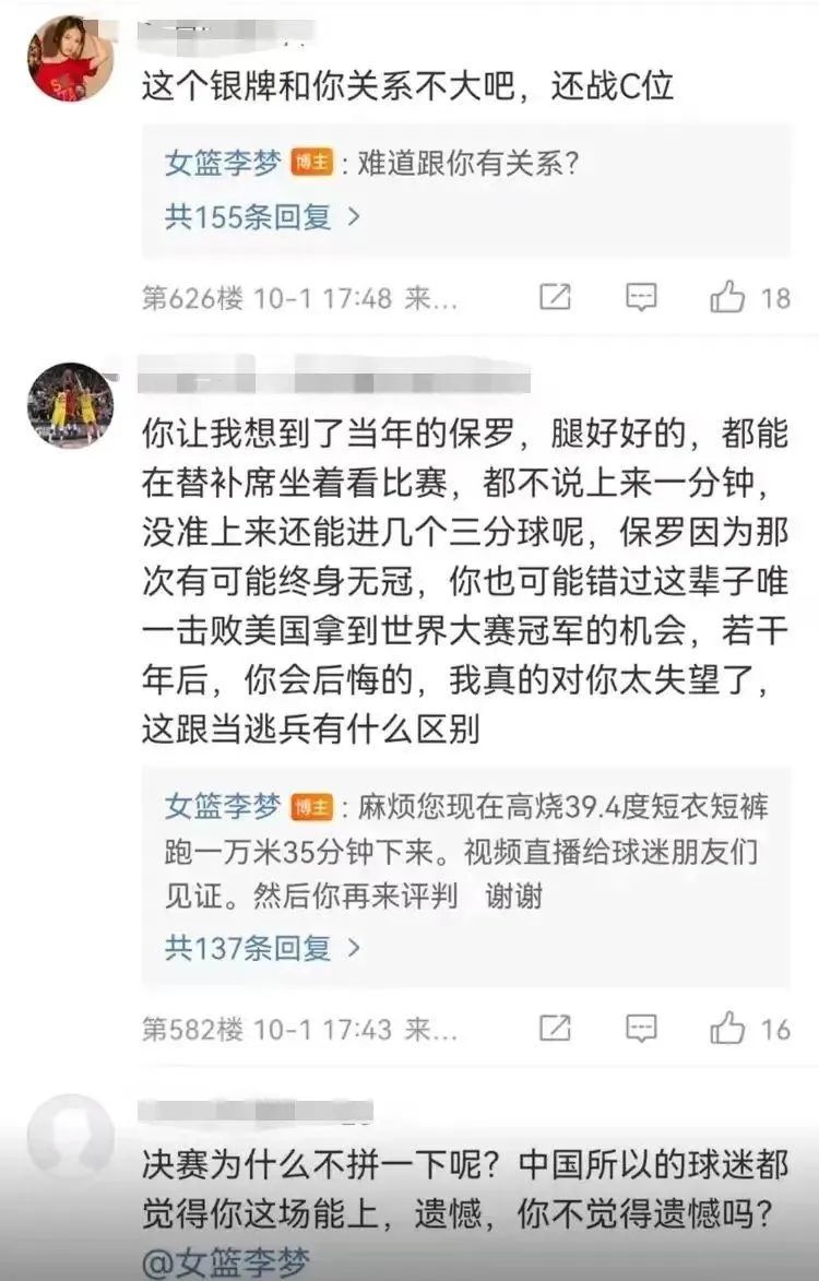 在她庆祝中国女篮获得世界杯亚军的微博里,评论区里却充斥着大量不和谐的声音: