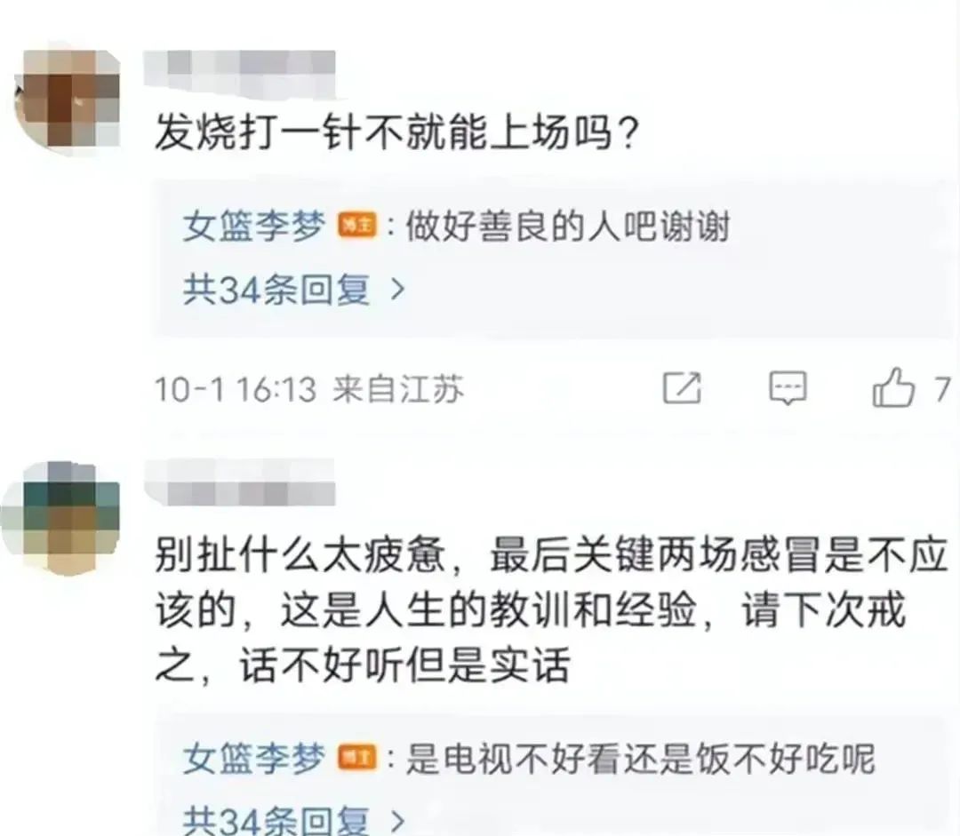 还有女篮运动员李梦,因高烧39.4度,只能缺席世界杯最后两场比赛。