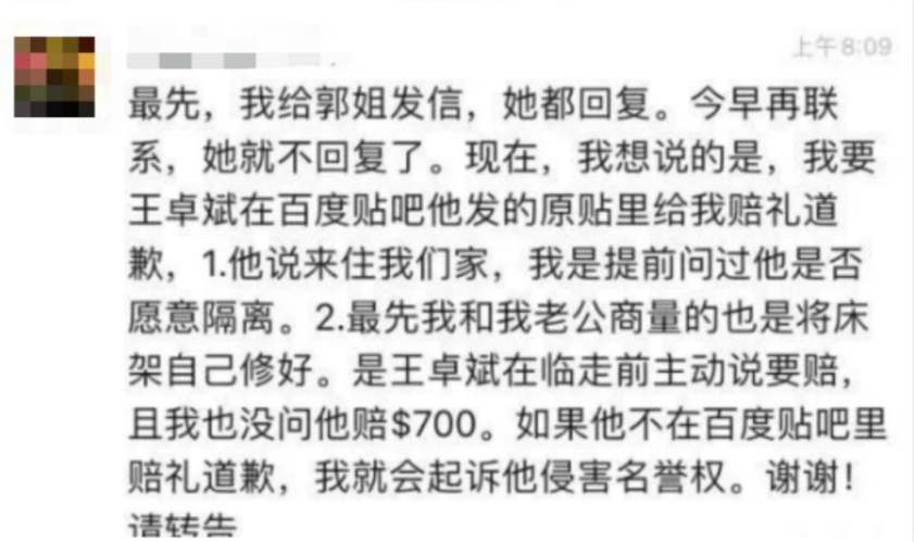 王卓斌称,“吴铮铮威胁他的父母”,要求他在原帖里赔礼道歉,否则将起诉他。