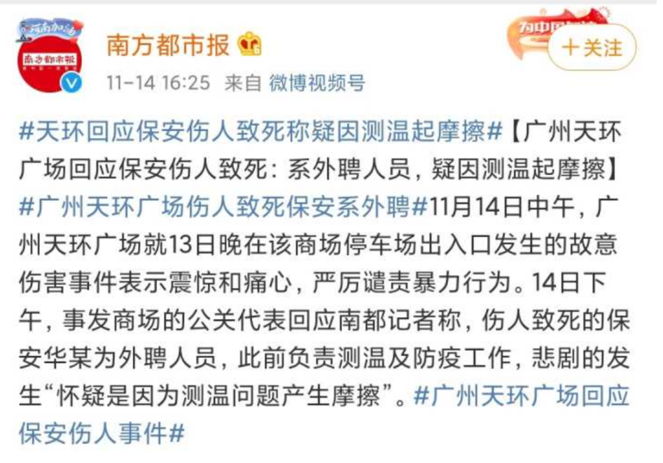 “该商场的公关代表唐先生回应称,伤人的保安是天环的外聘人员,此前负责测温及防疫工作,起因怀疑是因为测温问题产生摩擦,最后导致惨剧发生。”