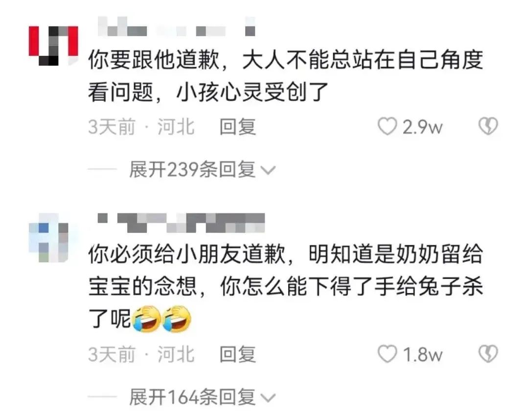 结果这一幕正好被放学回家的七岁儿子撞见,于是孩子崩溃大哭,拎起兔子的尸体不让大人煮。