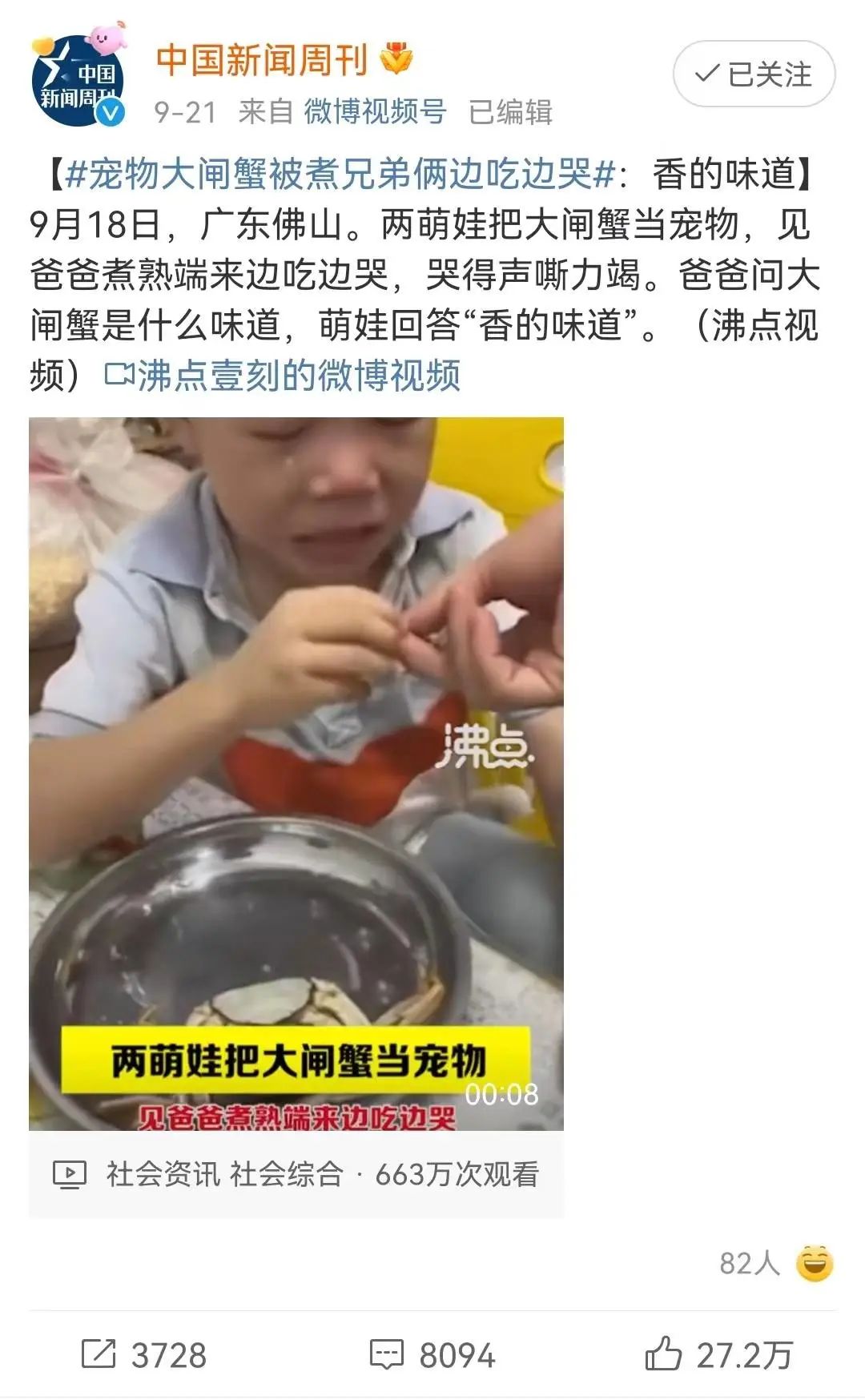 无独有偶,最近,广东佛山的一位爸爸也擅自把孩子养的大闸蟹煮了,还强迫孩子边哭边吃下去。