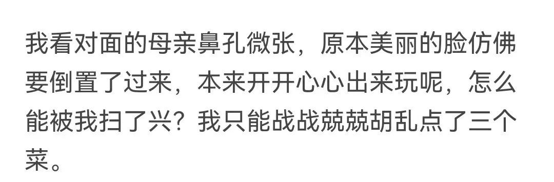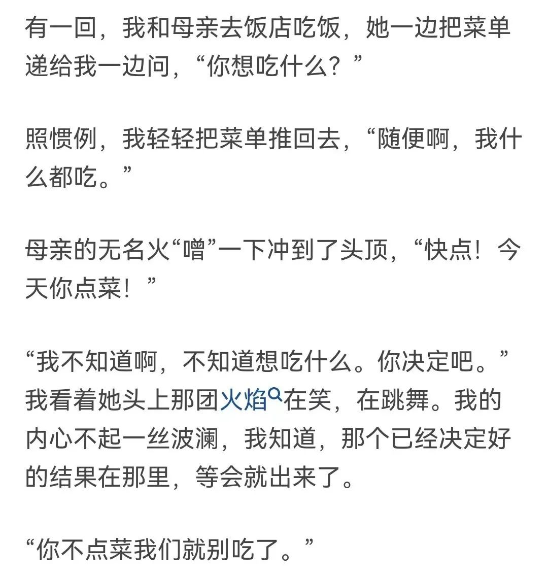 一次点菜时矛盾升级,母亲和他起了争执,认为他没有想法、没有主见,强迫他必须点菜,"不然今天都别吃了"。