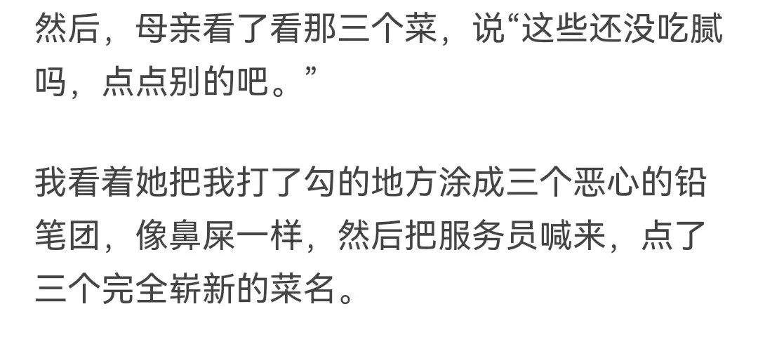结果,不出意料地,母亲像小时候一样,再次否定了他自己的选择,换成了别的菜……