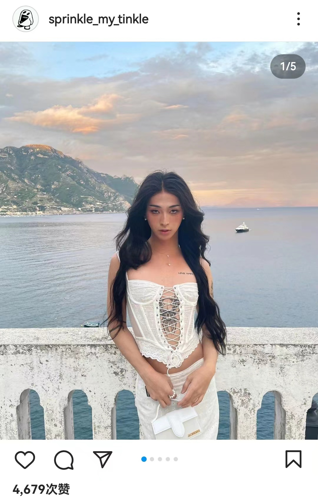 照片中的他一头浓密的大波浪,画着时下女孩子流行的妆容,巴洛克风格的白色性感吊带,搭配精致的珍珠配饰,手上还拎着一个小巧的白色手提包。