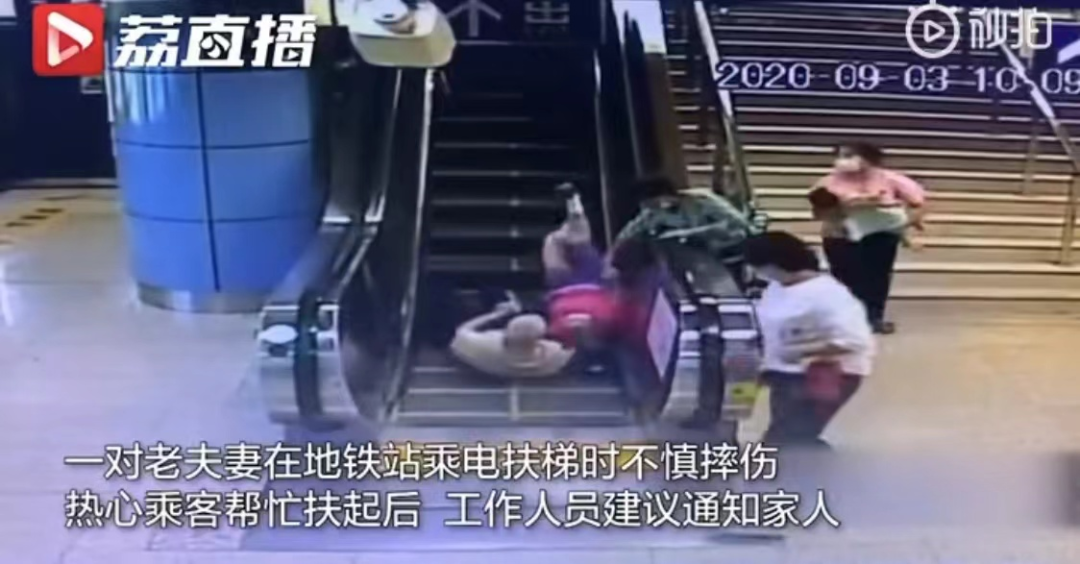 南京有一对70多岁的老人,摔在了地铁的电梯上。