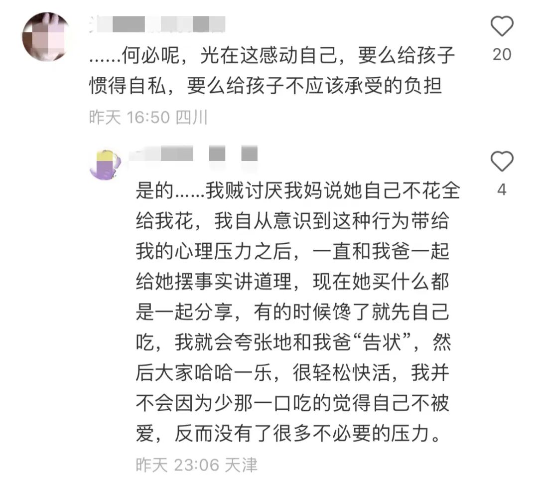 “何必呢?光在这感动自己,要么给孩子惯得自私,要么给孩子不应该承受的负担。”
