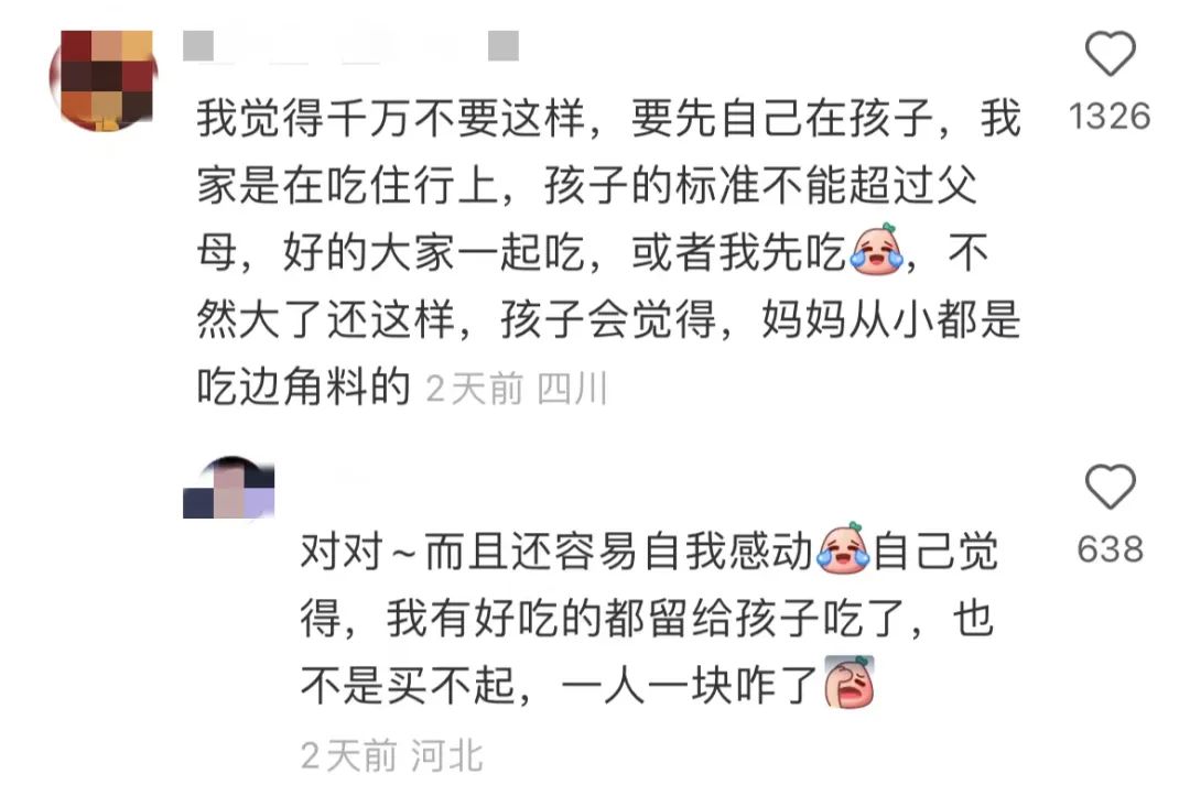 “我觉得千万不要这样,要先自己再孩子,不然孩子会觉得,妈妈从小都是吃边角料的。”
