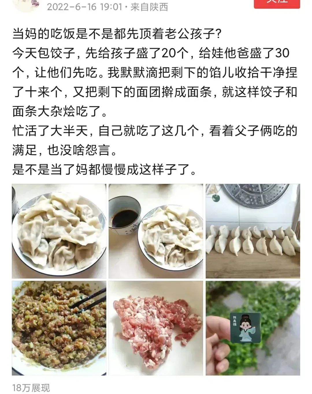 比如,“当妈的吃饭是不是都先顶着老公孩子?忙活了大半天,自己就吃点剩下的,看着父子俩吃得满足,也没啥怨言。”