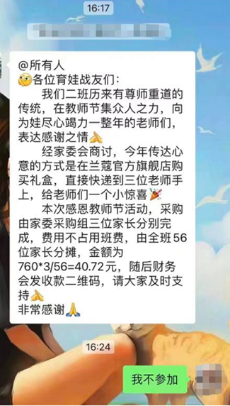 起因是一位家长为了彰显“尊师重道”的良好美德,在名叫“家长商量群”中鼓动大家出钱给三名老师买兰蔻礼盒。