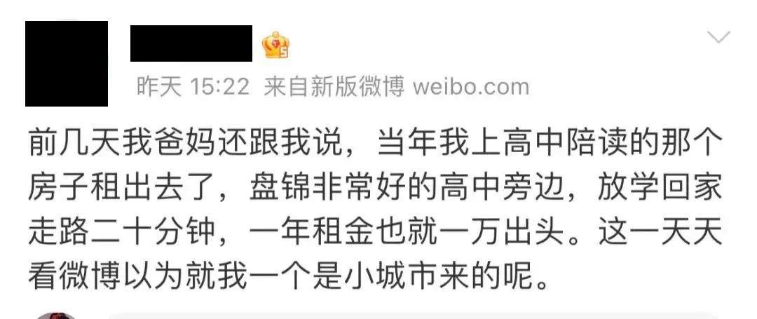 前几天看一位家在盘锦的博主发了条微博,说他妈妈把在盘锦老家的学区房租了出去,租金一年一万出头,可每天上微博,他还以为就他一个是小城市来的呢。