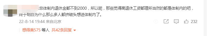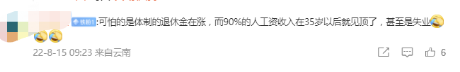 评论区各网友的回复,大概分为两类:一是感慨体制内好,退休后的退休金秒杀体制外的大多数人;二是抱怨现在的工资收入已到顶端,遭遇到了35岁的瓶颈期。
