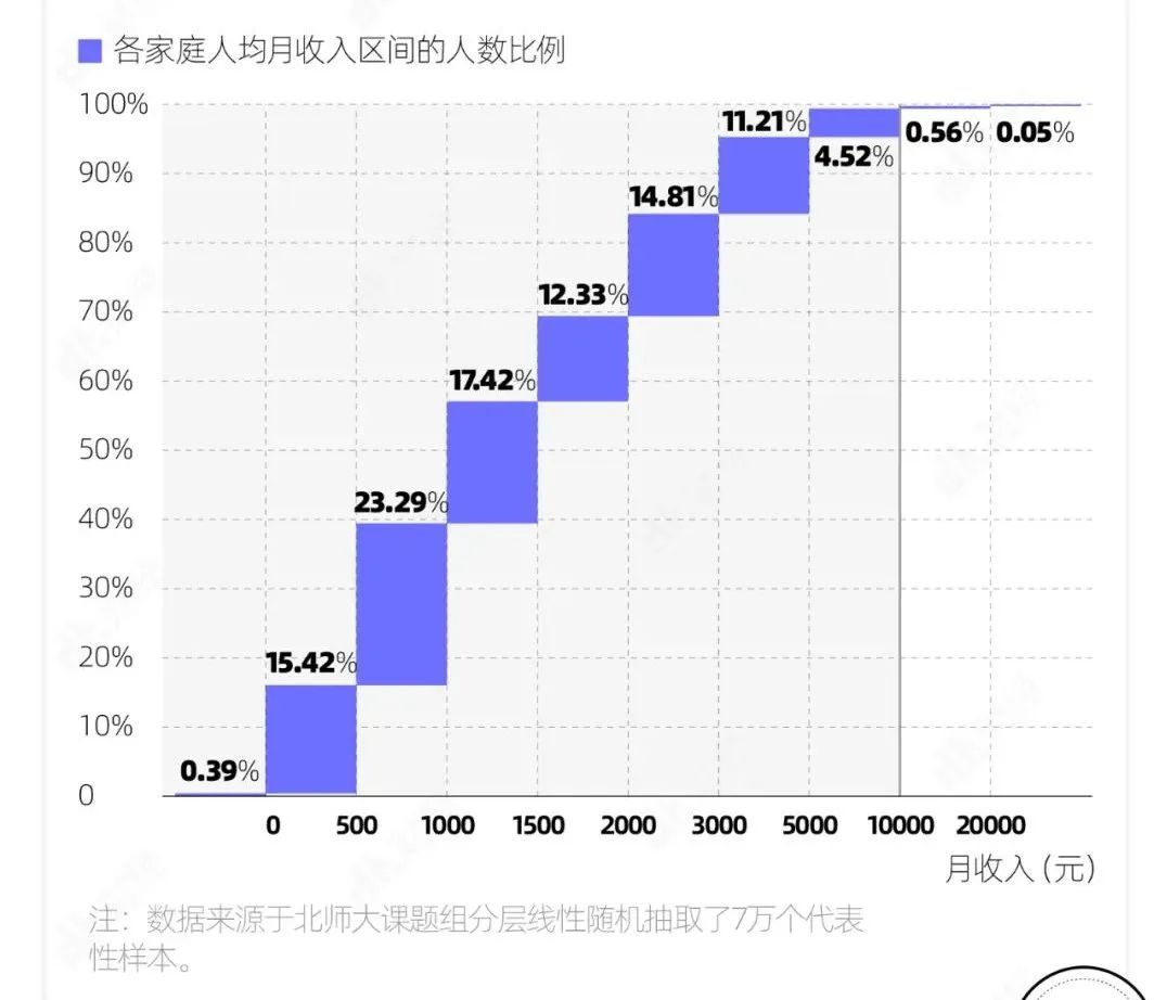 CHIP的最近一次调查时间为2018年,研究院官网并未公布相关数据,但该院研究人员在财新发布的一篇文章透露了部分数据结果,分层抽取了7万个样本的数据显示:人均可支配月收入(扣除个人所得税等之外可用于实际使用的可支配收入)在10000元以上的家庭占比仅为0.61%,人均可支配月收入在5000-10000元区间的是4.52%;而大部分中国家庭人均可支配月收入在500-1500元这个区间,占比约40.71%。