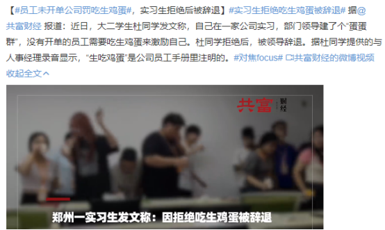 近日,大二学生杜同学发文称,自己在一家公司实习,部门领导建了个“蛋蛋群”,没有开单的员工需要吃生鸡蛋来激励自己。