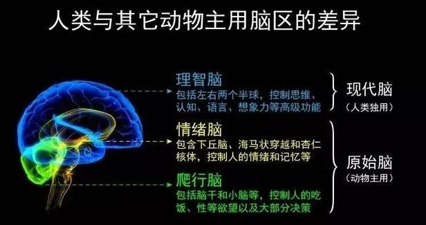 美国神经科学家保罗·麦克莱恩曾提出了“三元脑”模型。按照在动物演化历史中出现的先后顺序,人的大脑可以分为三部分。