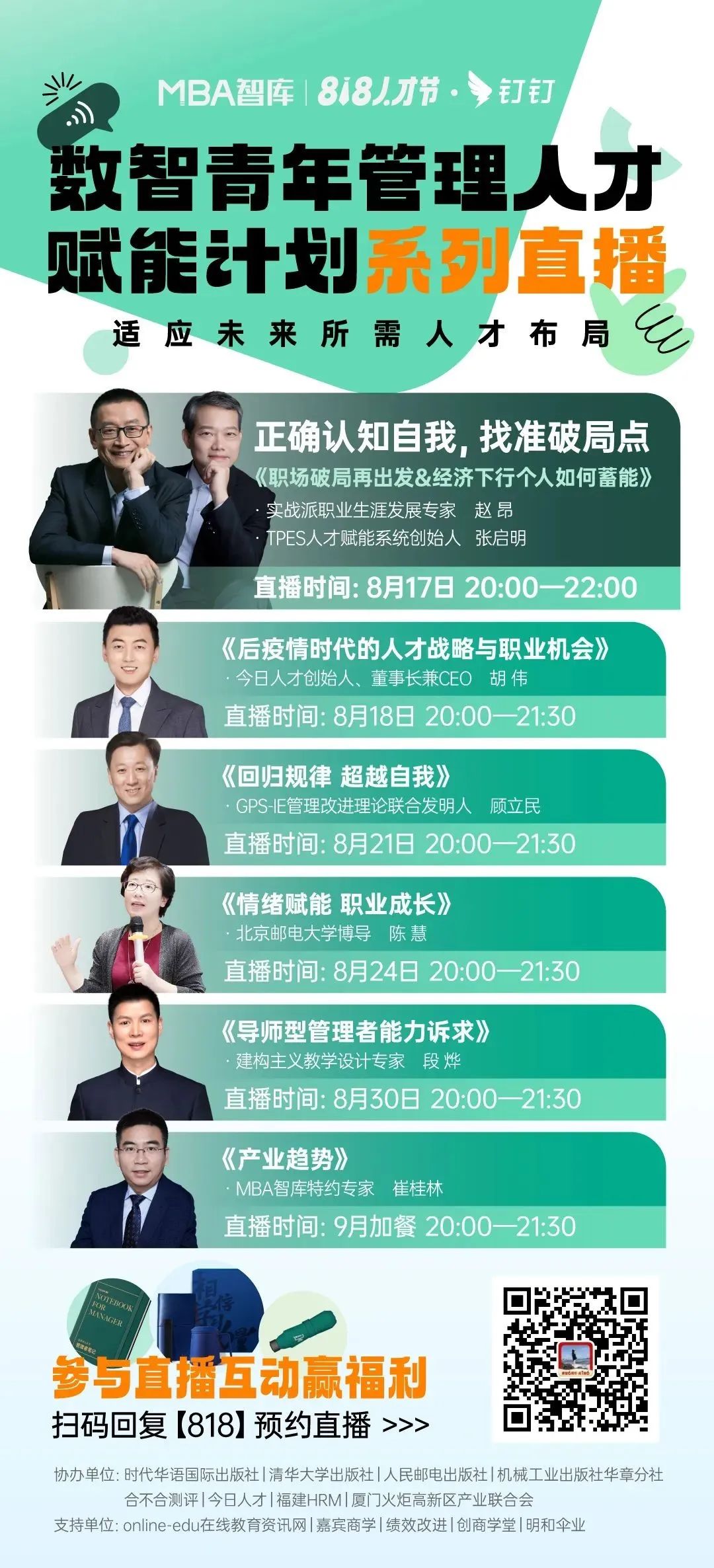 借势818人才节,MBA智库启动“数智青年管理人才赋能计划”,帮助职场人向未来趋势看齐,发展职场人的决策创造、组织管理、情绪赋能、环境适应力等多项能力!
