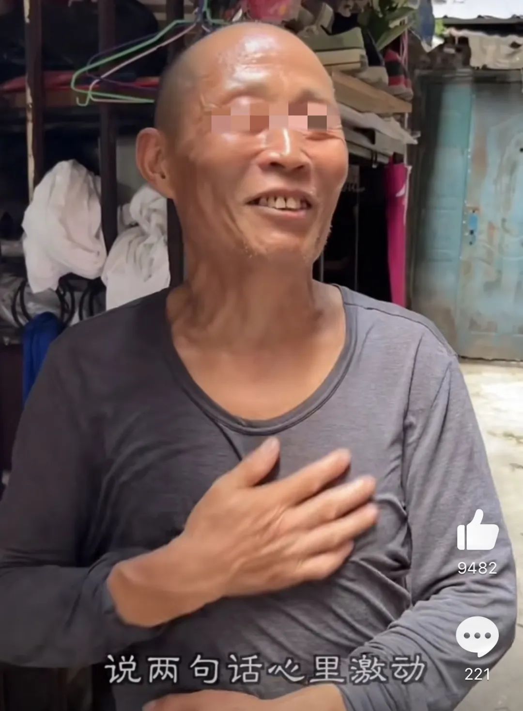 爷爷红着眼眶,但还是笑呵呵地对着镜头说: