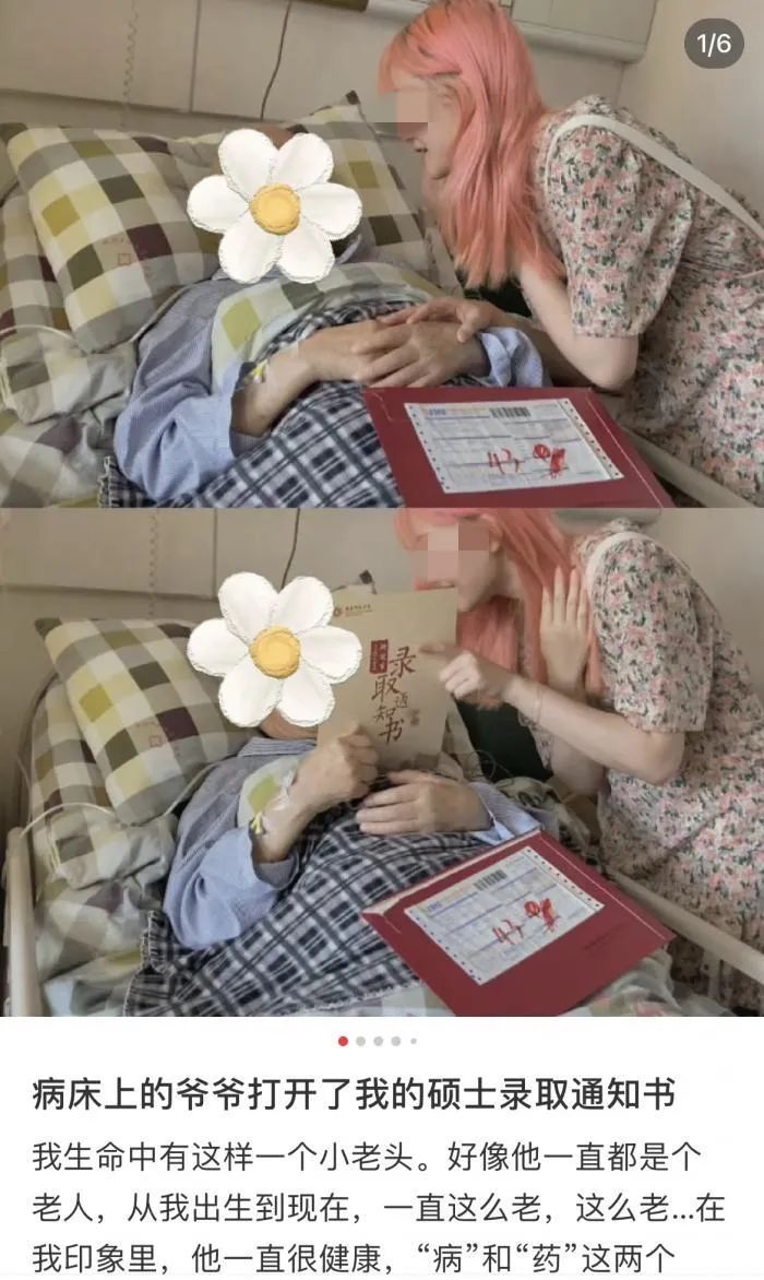 还有95后粉发女孩小郑,在考上了研究生之后,兴奋地把录取通知书拿给病床上的爷爷看。