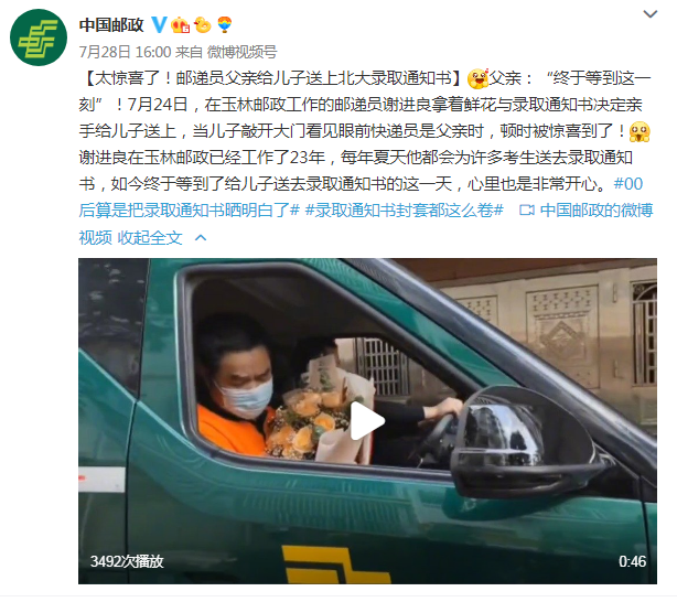 邮递员谢进良在邮政工作了23年,每年夏天都会为许多考生送去录取通知书,而这次他亲手为儿子投递录取通知书,相信那一刻父子俩内心都是喜悦的和自豪的。