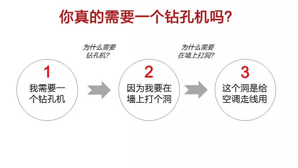 营销学中有个经典的“钻孔机”案例。当一个消费者跑来跟你说“我需要买一个家用钻孔机”的时候,仔细思考: