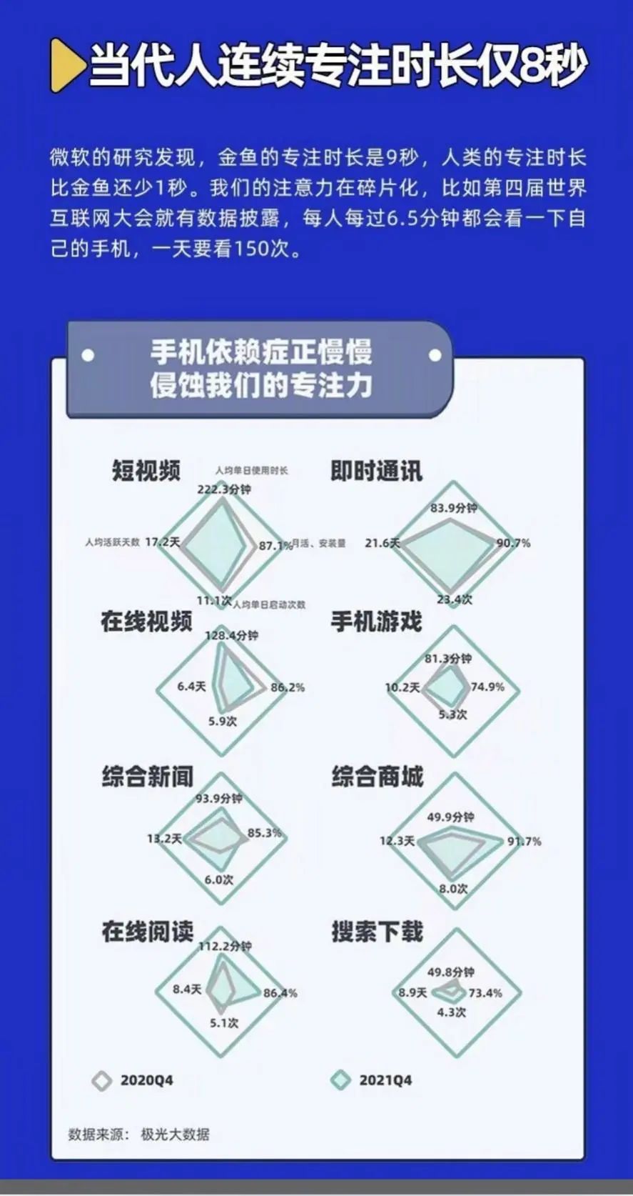 《2022国民专注力洞察报告》结果显示:当代人的连续专注时长只有8秒钟。