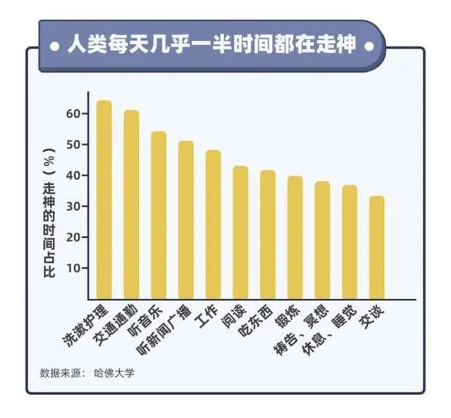 哈佛大学一位心理学博士曾指出,清醒的一天中,人几乎有46.9%,即将近一半的时间都在走神。