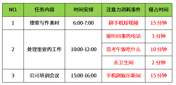 记录注意力的消耗,就和记账一样,要记录侵占注意力的具体事件和时间。