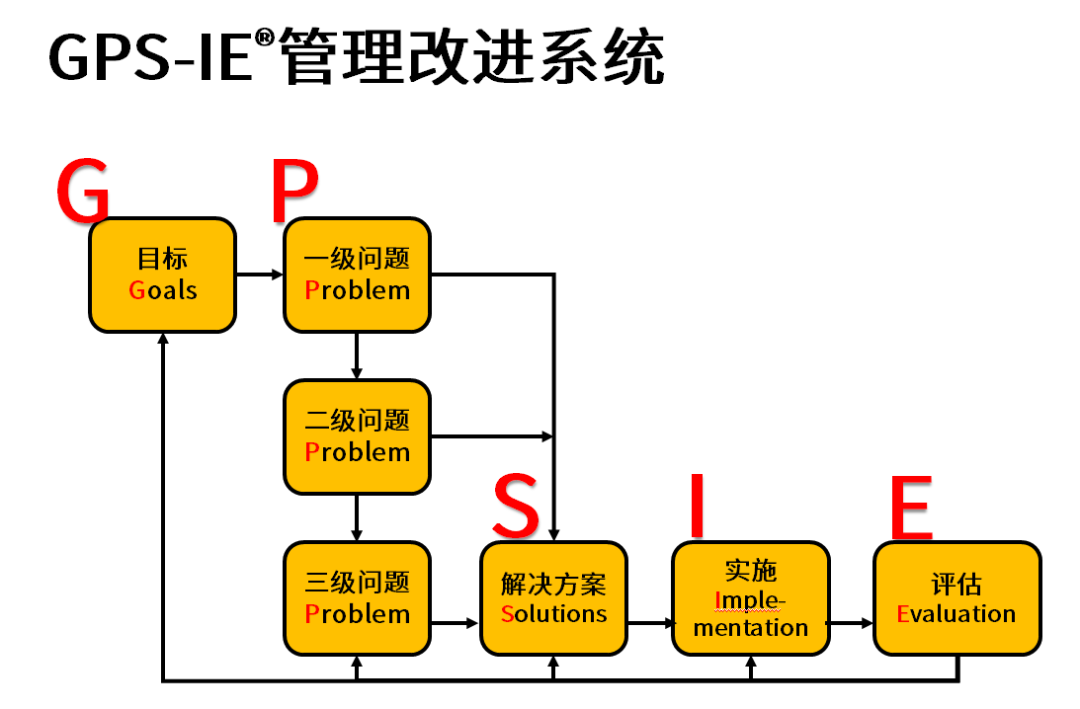 他还介绍了一个GPS-IE管理改进系统,他说自己平常做的最多的事,是把问题分成三级问题: