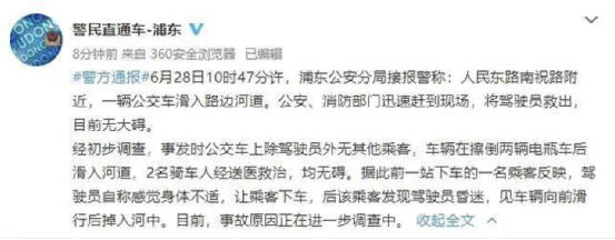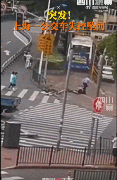 一辆公交车突发意外坠河。