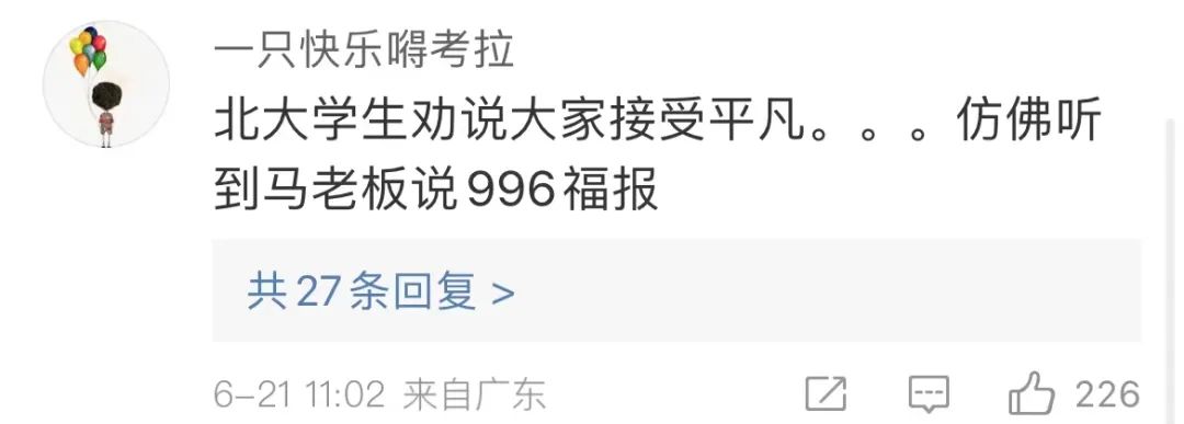 “北大学生劝说大家接受平凡......仿佛听到马老板说996福报。”