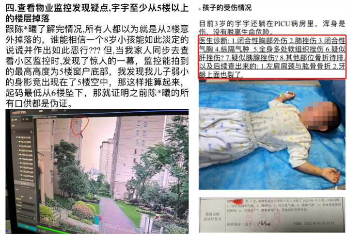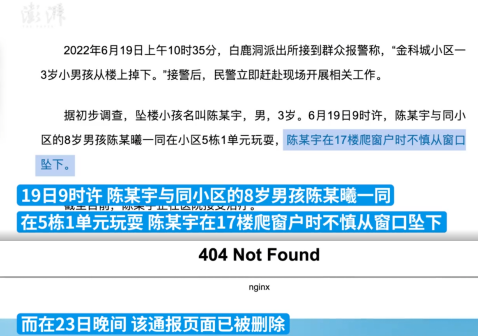 最初的通告,写的是小宇和同小区8岁男孩陈某曦一同玩耍,在攀爬17楼窗户时不慎坠下。