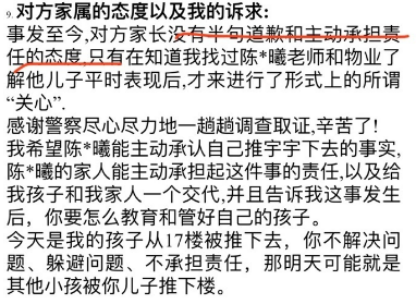 直到知道她去了陈某曦的学校,才发了个微信,说去医院看看孩子,但拒不承认自家孩子的过错。