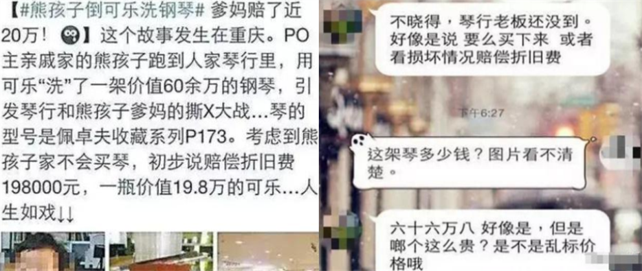 第一个是重庆网友自述,说一个熊孩子把可乐倒在他的钢琴键盘上,他妈不仅没让他道歉,还找借口说: