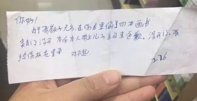 “我教子无方,儿子在你店里偷了四本画书。本应本人带着儿子来道歉,但贵店门没开,钱我给你放在里面,对不起。”