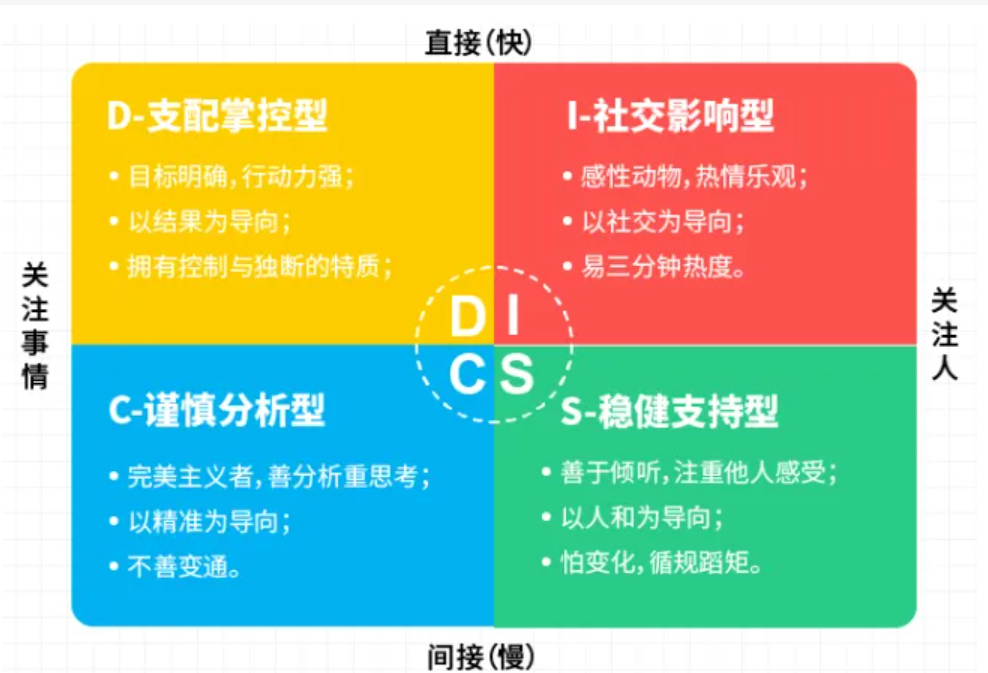 心理学家威廉·摩顿·马斯顿曾提出一套成熟的人类行为模型,简称“DISC”。采用支配掌控(Dominance)、社交影响(Influence)、稳健支持(Steadiness)、和谨慎分析(Compliance)对人进行分类,现代人的行为模式基本可以被囊括再这四个模型中。