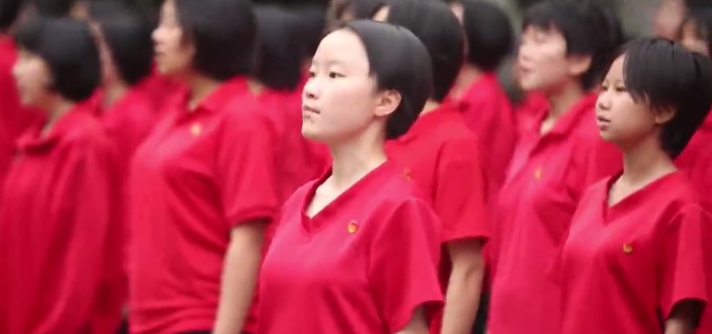 临出发前,在华坪女高操场上,张桂梅和大家一起唱响《万疆》,送高三的女生们加油打气。