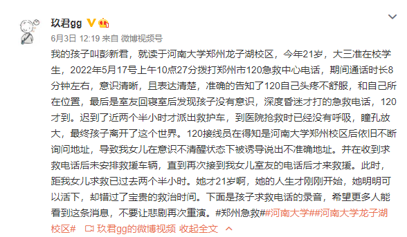 5月17日,河南大学龙子湖校区的大二女学生彭新君,在寝室忽然头疼,于是拨打了求救电话120。