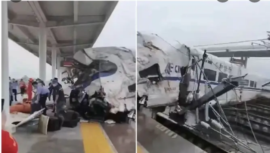 事故发生后,伤亡确定前,现场传来的图片视频忧心不已:列车车头横跨几条轨道,穿到了站台上,车头已完全撞烂撞毁。