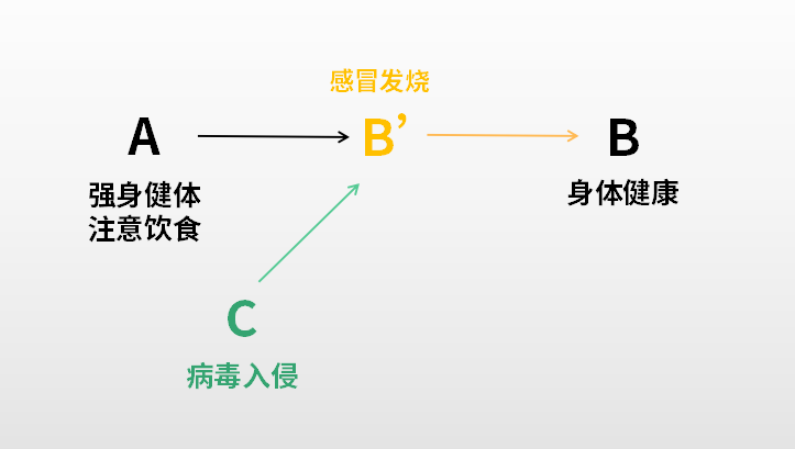 这个(C)也可能是外部变量,比如,你平时非常注意身体的保养,控制饮食,保持运动,可还是感冒发烧了,那就不是(A)有问题,而是有可能被病毒感染了,这个不可预料的病毒入侵,就是变量(C)。