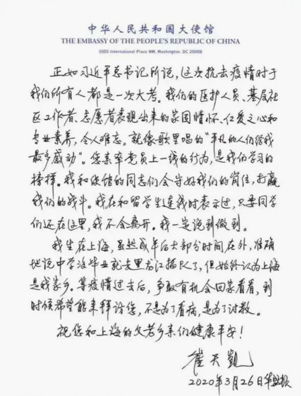 新浪微博做了一个榜单:2020年上热搜最多的20个人。张文宏就位列其中。他上热搜的次数,甚至超过了李宇春、李现。红到连中国驻美大使崔天凯,都给张文宏写了一封亲笔信:“到时候希望能来拜访您。”