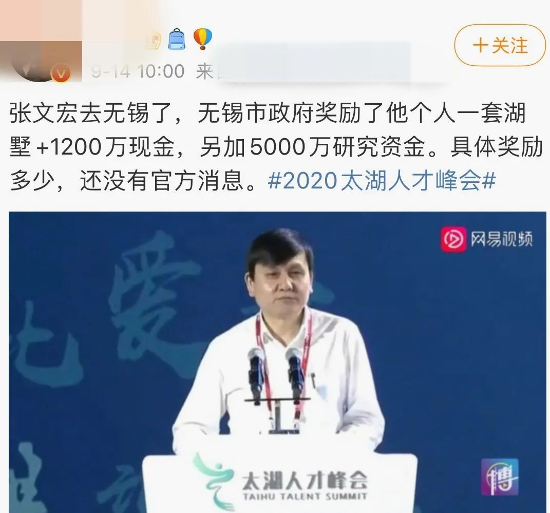 前段时间,一大V爆料:“张文宏去了无锡,被奖励一套别墅+1200万现金。”
