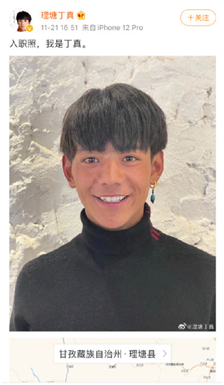9天后, “理塘丁真”发了一条微博:“入职照,我是丁真,丁真的第一条微博。”