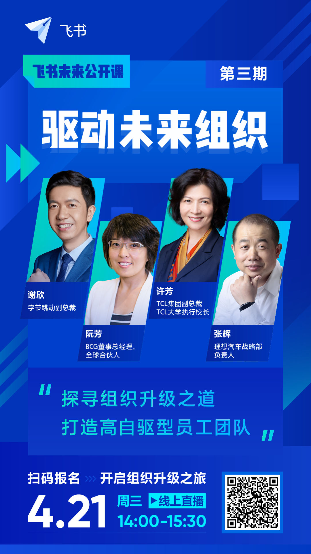 即将到来的飞书未来公开课第三期「驱动未来组织」,便是这样一个向优质企业取经的绝佳机会: