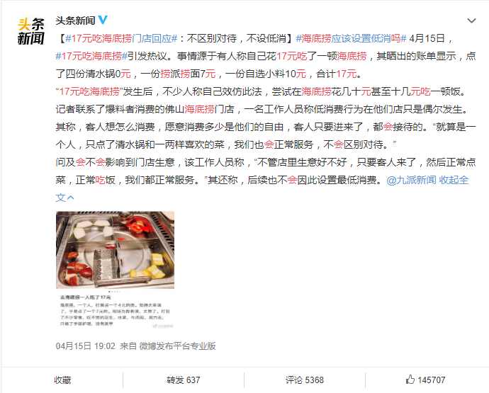 事后,作为当事人一方的海底捞大度的回应:客人想怎么消费,愿意消费多少是他们的自由,客人只要进来了,都会接待,不会区别对待,也不会因此设置最低消费。