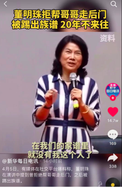 董明珠和哥哥闹翻被踢出族谱的事情,又让董明珠上了一次热搜。