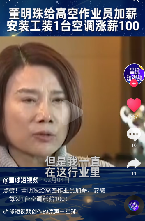 董明珠做得最轰动的事情,就是给空调安装工涨薪100,树立了行业标杆,她说,空调安装工那么辛苦,那么危险,这涨薪100是他们本来应得的。