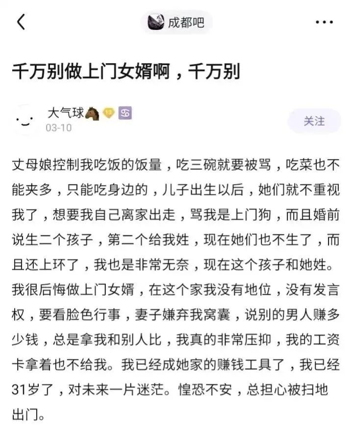 前几天,一位网友声泪俱下地发帖,现身说法:“千万别做上门女婿啊,千万别。”