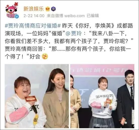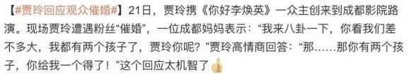 有一次,整个剧组到成都路演,在影迷见面会环节,一位妈妈问贾玲:“我来八卦一下,你看我们差不多大,我都有两个孩子了,贾玲你呢?”