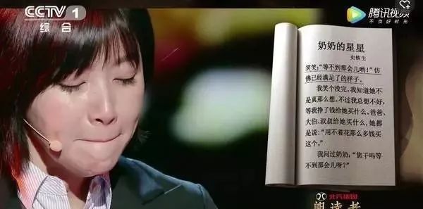 在一期《朗读者》节目上,徐静蕾朗读了史铁生的小说《奶奶的星星》,当读到“地上如果一个人死了,天上就会多一颗星星,因为它要给活着的人照亮”时,她的声音变得哽咽。
